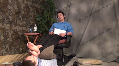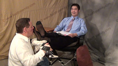 Dress shirt, dress slacks, loafers, & thick & thin dress socks, this hot Korean guy, spiked styled hair, ChinHo is sitting on easy chair with slave locked in the sissy trap at his feet while worship & sniffing the sweaty socks, then the sweaty perfectly shaped bare feet; ChinHo does a trial interview with Dr. Phil about taking over his boss and making him into a foot slave because he is Straight; responding....... (click video link to see full description)