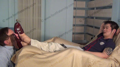 After college classes, Chin Ho, preppy, in penny loafers, burgundy thick-n-thin sheer socks; sitting on an easy chair on a riser far above with slave kneeling at his feet ready to be totally embarrassed & humiliated as he reads the rules and is in AWE of how foot sissys have to treat straight guys. He tells his buddy about it in the camera; his power over having foot sissys; sheer brown dress sock and bare ....... (click video link to see full description)