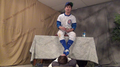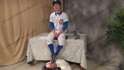 In full baseball uniform with blue Under Armor knee high sweaty baseball socks, this hot Korean guy, ChinHo is sitting in on the table with slave on the floor beneath his feet while worshiping & sniffing the sweaty socks, then the sweaty perfectly shaped bare feet as ChinHo tells his teammates about having foot slaves; ChinHo laughs, knowing that Straight Guys control & humiliate sissies ready to be totall....... (click video link to see full description)