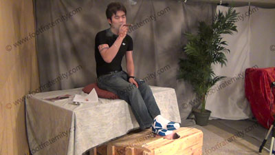 In dress shirt, tie & thin nylon socks, this hot straight stud is lying on the sofa while slave kneels at his feet to worship & sniff the sweaty socks, then the dirty bare feet; slave must make love to Roberto's feet as he ignores him while looking at his magazine; sock and bare foot love making; Roberto is cocky, arrogant as this service happens; four camera views (two close ups) & two hot full length angl....... (click video link to see full description)