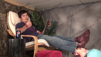 In jeans, T shirt, sweaty white short work out socks, sneakers, this hot Korean guy, ChinHo is lying on the sofa while slave kneels at his feet to worship & sniff the sweaty socks, then the dirty perfectly shaped bare feet; ChinHo laughs, knowing that Straight Guys Rule & humiliates slave at his feet ready to be totally embarrassed when he confesses to his Master of how much he needs to be at his feet. Soc....... (click video link to see full description)