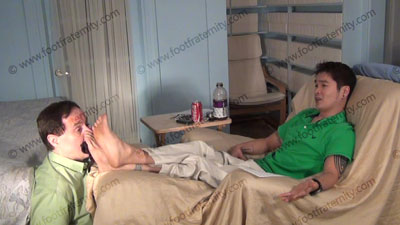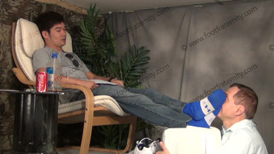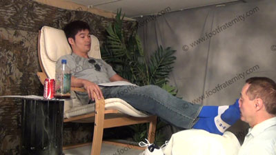 In shorts, sneakers & grey Puma gym socks, Chin Ho has slave chained to his feet as he lays back in his new chair with feet stretched out in the sissy's face for service; worshipping & sniffing the sweaty socks, then the sweaty perfect bare feet as he responds verbally with hot talk and responses, while his feet are worshipped, foot teasing, licking & worship; Chin Ho smiles and just watches the slave serve....... (click video link to see full description)