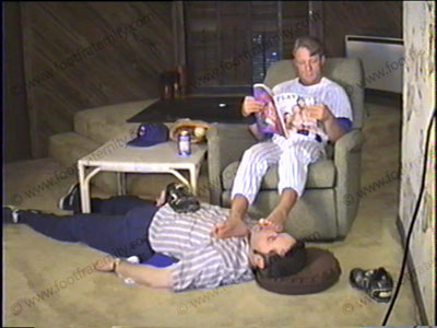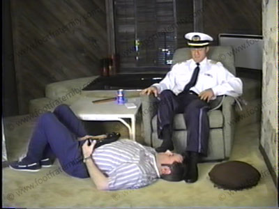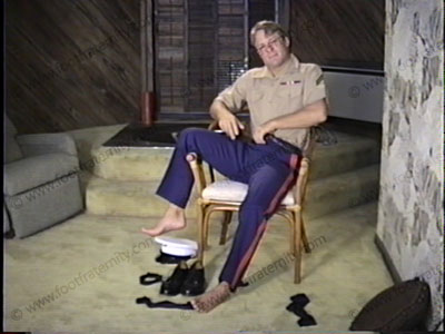 In his Airplane pilot uniform, he comes home to have his loafers licked, his thin, nylon dress socks sniffed, (much sock action) his bare feet served a lot & licked, feet massaged as he answers questions sent in by Frat members while looking right at you (the viewer). Much verbalization, humiliation, standing on slave, spitting in slaves mouth, lots of hot talk, clips toe nails in slaves' mouth, is used as foot stool & total foot slavery. A long, hot scene!