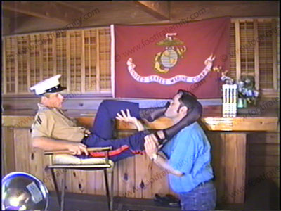 In Marine uniform, he is getting foot lovemaking to his marine oxfords, sheer cap toe sox, then his bare feet from two different views while he expects this love. Just music background, & Marine foot lovemaking make this a sensuous, hot, foot love tape. Close ups, & full shots!