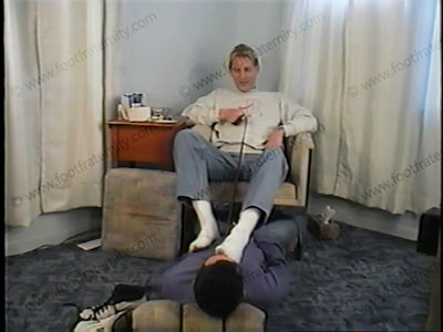 Wearing jeans, white socks & dirty shoes, his slave is beneath his feet to serve and worship. While relaxing he reads a confession letter from his slave. This 40 year old stud has grown his goatee and smokes and ashes in his slave’s mouth. He embarrasses him with much foot action, service, adoration, licking, sock sniffing, footrest to this hot guy’s size 11 feet. He tells of experiences with a foot sla....... (click video link to see full description)