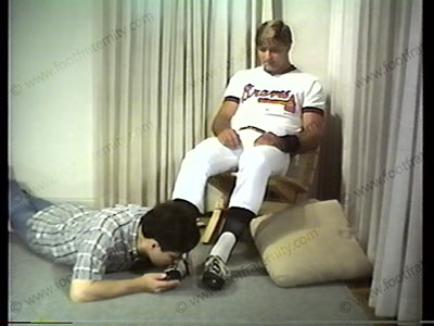 In Baseball uniform as his servant licks his cleats, smells dirty white socks & licks & kisses his bare feet. Gives orders to have the slave do his foot, sox & cleats service.