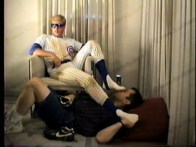 In shades, baseball uniform, spikes and sweatsox, Hale orders Darren to lick, taste and smell his yuppie stud feet. Great attitude and hot verbal abuse.