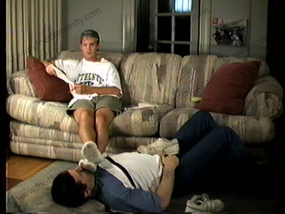 In baseball cap, white T-shirt, shorts, sneakers and sweat socks, Hale watches straight films while slave takes care of his footwear, socks and feet. Hot feet close ups!