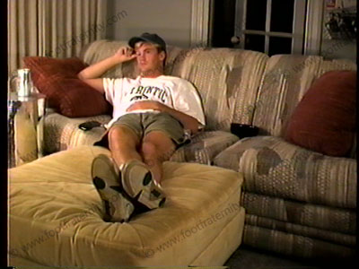 In white sweat shirt, shorts, white sox and sneakers, he reads hot foot scene story as camera lovingly roams in and on his sexy feet. Much close-ups of his yuppie feet. He is solo in this scene.