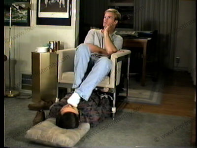 Casually dressed with bucks and sweatsox, answers questions while his slave is tied spread-eagled at his feet. Blackmailed with photos and totally humiliated, the slave worships Hale's feet, giving them deserved respect.