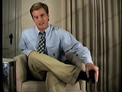 Executive Hale, in tie, lace ups and black socks, talks to the camera to a Frat guy, telling him what he wants to hear. He removes his shoes and gold toe socks, puts shoes on without sox. Then servant comes in to lick shoes, smell sox and worship the feet of this preppy as he watches and gives orders.