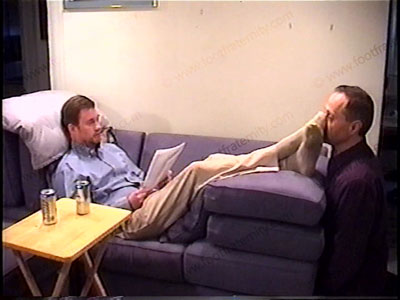 After work, he is in a dress shirt, and slacks, tan businessman socks & cordovan kiltie loafers, as he relaxes with his foot slave kneeling at his shoes for worship. After licking the shoes, sock sniffing foot kissing & bare foot service. He gives comments, commands, teases, takes a nap while slave makes love to his feet, relaxes to being worshiped & takes power over submissive guys. He is cocky, arrogant, ....... (click video link to see full description)