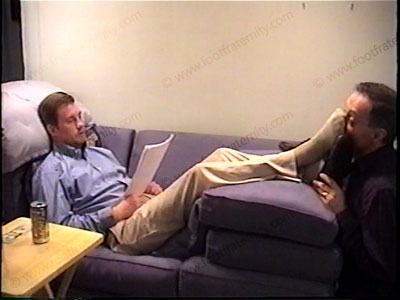 Blonde yuppie in black denims & dress shirt gets served by buddy who gives him respect & foot love on his thin dress sox & bare feet.