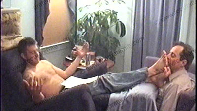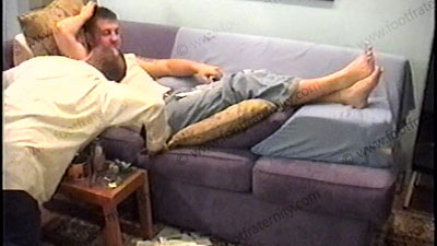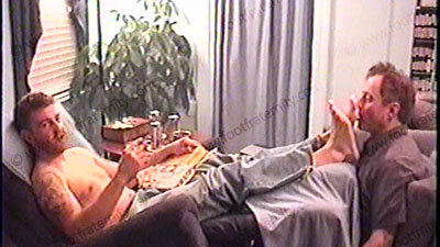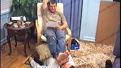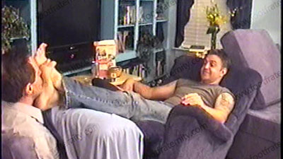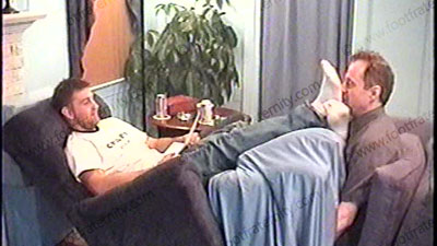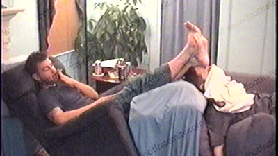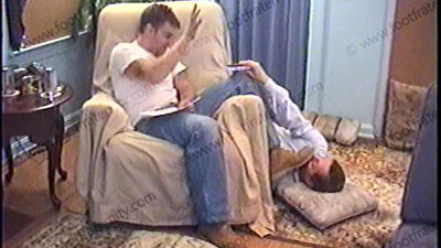 After work, Travis’ brother, Jay, is wearing a sleeveless Under Armor T-shirt, white short sweat socks with grey soles & sneakers as he relaxes on the Lazy-boy with his foot slave pinned at his feet for worship & service of his sweaty socks & perfect high arched bare feet. During this worship, he responds to a note from his straight buddy, Jason, about this position that he is experiencing of controlling....... (click video link to see full description)