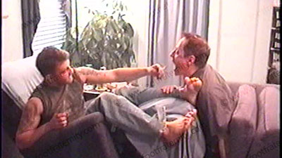 In jeans, sweaty white socks and NO shirt, he has his socks sniffed & worshipped as he rubs them all over his sissy's face, then his bare feet licked, kissed, toes sucked & more as he tells his brother, Mike, all about this scene & having a foot slave just because he is straight. He is macho, tough & cocky as he shows off to his brother all that he can do to a foot sissy including humiliation & tormenting h....... (click video link to see full description)