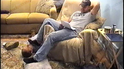 After work, he is in jeans, baseball cap, black sweaty thick socks & boots as he relaxes on the sofa with his foot slave kneeling at his feet for service of his sweaty socks & bare feet worship. During this worship, he taunts, teases, humiliates & dominates his sissy slave. He is into controlling, commanding, with verbal control & enjoys the power of being a Straight stud with slaves who pay to be humiliate....... (click video link to see full description)