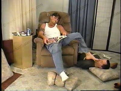 In T-shirt, & white socks, sneakers JT relaxes `to try on some sneakers to replace his old ones. Just a few commands, but mostly non-verbal after that as he looks at Playboy magazines and a straight video while he has his socked & bare feet serviced. We have to kiss his feet, sniff socks & massaging. He ignores his slave while enjoy the hot women in the tape as his feet have a love scene of their own from h....... (click video link to see full description)