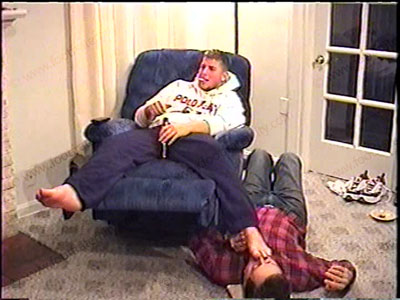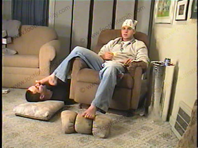 In jeans, sweatshirt, & white socks JT relaxes in a Lazy-boy lounger, to try on some sneakers to replace his old ones. Just a few command, but mostly non-verbal after that as he watches a straight video while he has his bare feet serviced. Mostly bare foot scene – we have to lick his feet, kiss his feet & massaging. He ignores his slave while enjoy the hot women in the tape as his feet have a love scene o....... (click video link to see full description)