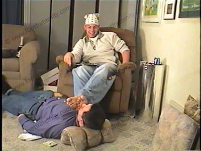 In sweat pants, muscle shirt, white sweat socks & boots, this tough jock football player – JT, has his Timberland boots licked while he reads the "Heterosexual Guy’s Rule Book and Laws for Sissys". He laughs at the laws, which were set up by straight jocks for sissys to always obey. He makes comments about them and decides how the slave must obey them as he has his boots licked, then removed for sock & ....... (click video link to see full description)