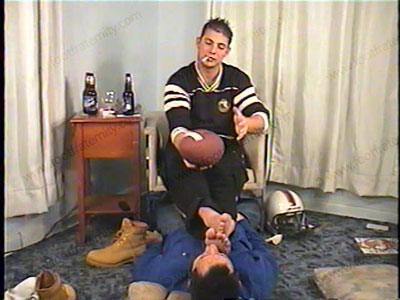 In sweat suit, Ralph Lauren white sweat socks with black cap heel and toe, & boots, this tough jock football player – JT, has his Timberland boots licked while he talks about football. He just got back from a game and tells about it while having a cigar and "ashing" in his slave’s mouth. After the full view scene, we see the ACTUAL high school game in which JT scored the game winning touchdown! He is nu....... (click video link to see full description)