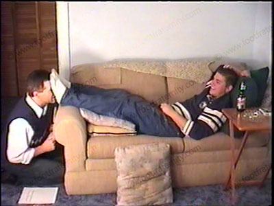 After workout, jeans, sweaty white socks, JT sits back to have his meaty, macho feet served as he dominates again. He is such a football jock & can't manage a simple declarative sentence, but he utters his thoughts in few words & watches the whole service take place. Socked feet sniffed & adored. Then bare feet & toes licked, kissed & sucked as he watches. Two views of this scene, one close up. He is in control again.