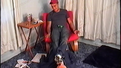 It all continues from the tape above … more domination, more teasing, more foot action, - water sports: Korie uses a bong to force him to drink it all, Dirk makes it go all over the mouth, face and shirt… More foot licking, sock-smelling Hockey dudes laughing their asses off while teasing a slave who must worship them as gods.