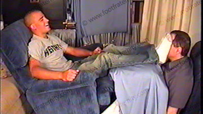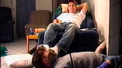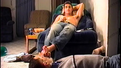 In jeans, sweaty white socks, Korie kicks back a recliner & teases his slave at his feet while telling comments from Straight guys. This jock loves to tease and place us under his sweaty socked & bare feet. He removes his shirt to show his hot tanned chest. Two views of this scene, one full, one close up. He gives commands in a teasing friendly & fun manner. He rubs feet all over face, as he takes control over his slave. He laughs & loves teasing in a controlling but friendly manner.