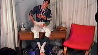 In baseball uniform, sweaty white socks with stirrups, Korie removes cleats & responds to his buddy, Matt, about having foot slaves & what he does to them. Socked feet dangles in his bitch's face, sniffed & adored as he sits on desk above him. Some trample, spit, & bare feet licked, kissed, toes sucked & more, as he rubs his feet all over the guy's face. His is empowered by his ability to dominate & set the....... (click video link to see full description)