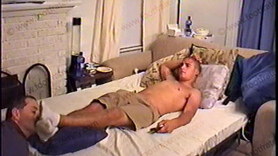 The first part of this film is bare chested Korie in only jeans & barefoot while dominating his bitch with orders to kiss, lick & worship his bare feet while he comments on this worship & adoration. Then he orders a str8 film be put on for him to enjoy. He enjoys the pleasure of the film while the slave is worshipping his bare feet. (Two views) Much toe wiggling & laid back attitude of being a Str8 Master to us all.