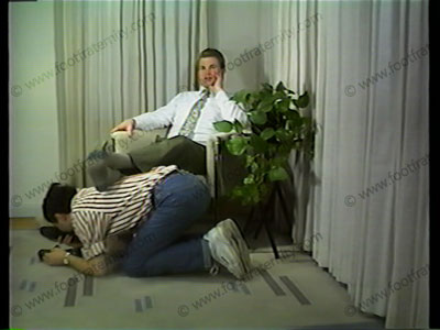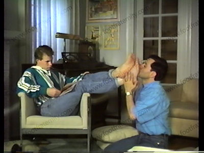 In shirt, tie, black loafers, dark dress socks, he teases the hell out of his foot servant to kiss his shoes, smell his sweaty sox, then barefoot action. He ribs, makes fun of, is arrogant, with much verbal humiliation & teasing, Then has champagne poured over his sweaty feet, forcing slave to drink it after & lap it from his sweaty soles.