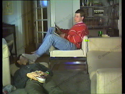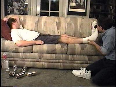 In shorts, sneakers, sweaty white sox, after a night of drinking, Kyle is passes out on the sofa as his roommate sneaks in and licks his sneakers, smells his white socks, licks & kisses the barefeet of this sleeping hunk of a yuppie. No verbal, just taking advantage of Kyle while he has "passed out."