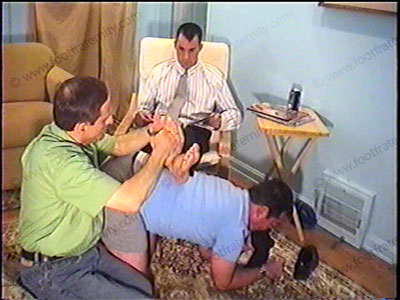 In dress shirt, tie, straight tip shoes & dark dress thick & thin socks, this really good looking stud relaxes & humiliates, dominates & teases his sissy slave at his feet during this audition film for the Jerry Springer Show. He talks to slave & the camera while his slave is serving his feet. He embarrasses slave, wipes his feet all over the face while doing the audition. Total foot teasing, kissing, lick....... (click video link to see full description)