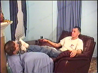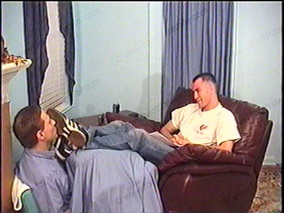 After a workout, this straight Jock is wearing a T-shirt, white Adidas short sweat socks, & sneakers as he relaxes on the Lazy-boy with his foot slave pinned at his feet for worship & service of his sweaty socks & bare feet. During this worship, he gets a confession from his slave about serving his feet. Much teasing, feet in the face, (socked and bare) in all forms of foot action. Two views of this scene,....... (click video link to see full description)