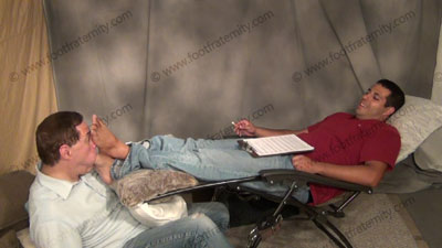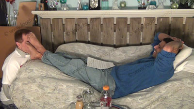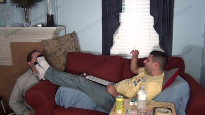 In jeans, sweaty sheer socks, then bare foot action as he has lays back on lounge chair with slave at his feet the whole time to make love to his sweaty socked then bare feet; He ignores him with his feet in the foot lover's face; He says very little, just relaxes and reads, then watches as he sees love making to his macho feet. He relaxes while smoking & taking in his power over foot lovers; three camera ....... (click video link to see full description)