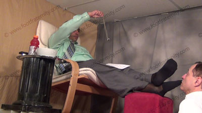 In dress shirt, tie, brogues & thin nylon blue thick-n-thin sheer dress socks, this hot straight stud is sitting above his bitch for worship & sniffing the sweaty socks, (no bare feet) while sissy kneels at his feet the whole time. Roberto laughs, knowing that he rules a priest who wrote him a huge fan letter! He humiliates slave at his feet while making fun of his power with his feet. Pure sheer socked foo....... (click video link to see full description)
