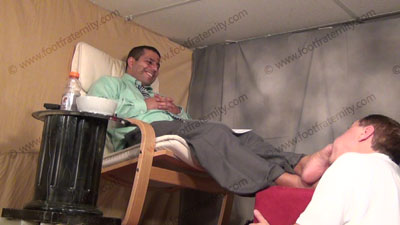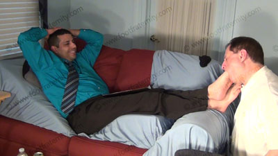 In dress shirt, tie, brogues & thin nylon black tux sheer dress socks that he actually wore for his straight marriage, this hot stud is sitting above his bitch for worship & sniffing the sweaty socks, (no bare feet) while sissy kneels at his feet the whole time. Roberto laughs, and brings sissy back into state of hypnosis so he must worship the feet of this Latino god! He humiliates slave at his feet while ....... (click video link to see full description)