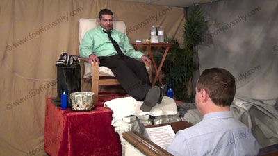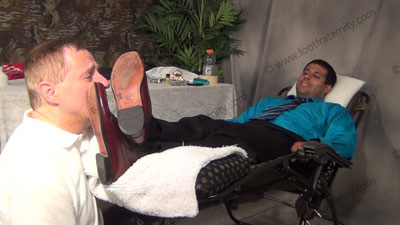 In dress pants, shirt tie, lace up shoes & sheer royal blue dress socks, Roberto sitting above on a stage with slave kneeling at his feet to be totally embarrassed & humiliated as he celebrates his anniversary of marriage to the feet of this stud as they continue to play the "newlywed game" to humiliate the slave kissing the socked toes, smelling them, worshiping the straight stud's socked feet as he teases....... (click video link to see full description)