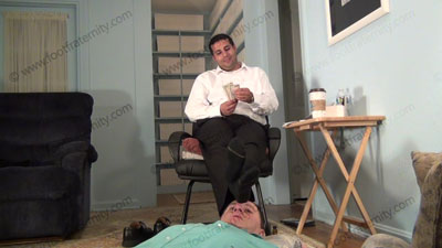 In shorts, T-shirt, sheer cap toe sox; Master Roberto has his slave locked in the box exposing only the slave’s head. As he relaxes in an easy chair, Master takes money from his slave; teases him with his feet right in the face of the slave as he sits back, commands foot worship, torments him; sheer socked foot adoration and mocking the helpless slave. The feet can be seen thru the sheer socks, but no ba....... (click video link to see full description)