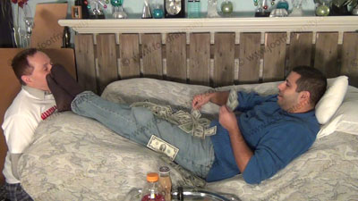 In jeans, very sweaty thin socks, very cocky Latino Stud Roberto is teasing his slave who is kneeling on the ground at his feet to be totally embarrassed and humiliated as Master Roberto lays back on the sofa and has his sweaty socked feet in the sissy’s face to torment and tease and mocks his slave while he gives commands, orders and responds to his foot licker! Slave kisses and serves the socked feet, -....... (click video link to see full description)