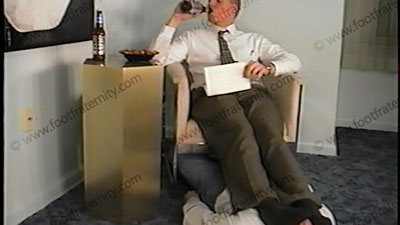 Home from work in shirt, tie, dress slacks, dark pattern dress socks, cordovan wing tips, he has shoes licked then removed for sock & foot adoration as he reads a humiliating letters written to him by a member from the Fraternity. He uses domination, humiliation, teasing, using him as a footstool, etc. He humiliates him, then sock sniffing, bare foot worship. He laughs at the slave as he teases him with hi....... (click video link to see full description)