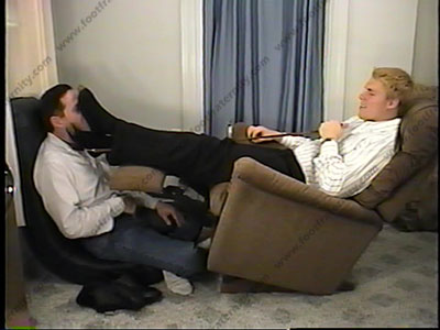 While asleep in his Lazy-boy lounge chair, Troy is in boxers & T-shirt, sneakers & short white sweat sox. His buddy comes in to lick his shoes, sniff his sox & worship his bare feet as this blonde god is napping. Then a complete massage of feet, legs, arms, etc. Two great views of touching & loving the feet of this beautiful man.