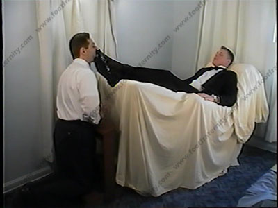 Troy is in full tuxedo with black thick-n-thin socks & Bally patent leather shoes. He finds his slave at an altar of his shoes, & photos of Troy’s bare feet. He laughs, puts a collar & leash on him & brings slave into his room for service at this feet. Troy finds a letter that his slave wrote to a friend. Troy is lying back on a lazy-boy chair with slave pinned at his feet. Shoe licking, much sheer sock a....... (click video link to see full description)