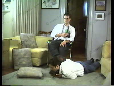In t-shirt. dark slacks, open tie, he blackmails slave to worship boots, socks, bare feet. Verbal abuse, butt paddling by prep stud.