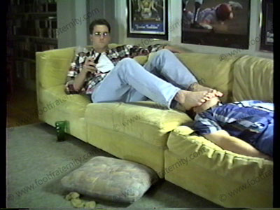 In white shirt, jeans, he lets buddy savor loafers, socks & bare feet. Good leg work, much foot in mouth action.