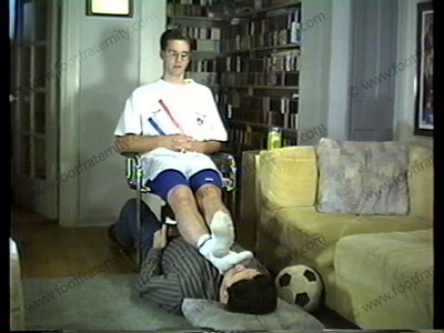 Sitting in easy chair, Soccer player Ty has his sneakers cleaned, then his very sweaty white athletic socks smelled, using the servant's body as a foot stool & slave. Occasional teasing remark & degrading talk as he sits back looking at his hot magazines. Then uses him as foot stool, then gets bare feet serviced, licked & cleaned! This hot guy gets his revenge on his slave foot slaves as he wipes his feet on us. Total humiliation & foot loving. Ty is now older & experienced at this action.