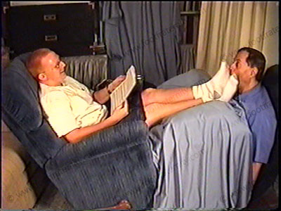 After the gym, in T-shirt, shorts, white sweat socks & sneakers, he relaxes on a chase with his foot slave kneeling at his feet for the service of his sweaty socks & bare feet worship. Then bare feet & toes licked, kissed & sucked, ashing, as he watches. Two views of this scene, one full, one close up. He looks at pix of women serving guys feet & loves the idea, making many straight comments. Gets his toes .......